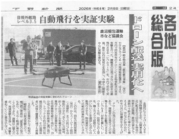 この度、ドローンを活用した新たな物流への取り組みが、地元紙である下野新聞(2026年2月8日付)に掲載されましたのでお知らせいたします。